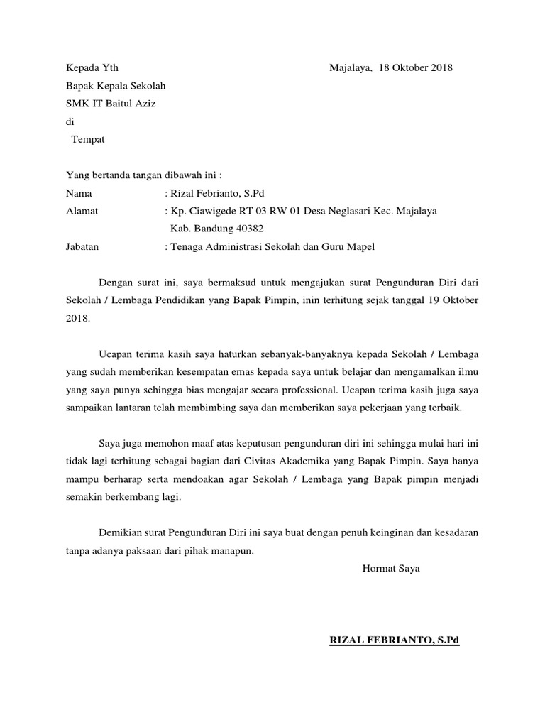 Contoh surat pengunduran diri sebagai anggota koperasi. Namun dikarenakan alasan tertentu, seorang guru bisa saja mengundurkan diri dari pekerjaanya. Contoh surat pengunduran diri kerja yang benar serta baik, pengajuan pemberhentian kontrak kerja secara sepihak yang dilakukan oleh pekerja lajimnya nah untuk sahabat yang memiliki status sebagai guru honorer pada sebuah sekolah dan tentunya sudah tidak nyaman lagi dengan gaji yang. Surat pengunduran diri tersebut juga bisa digunakan untuk mengundurkan dari oraganisasi seperti oleh sebab itu alangkah baikknya kalau kita kenal lebih dalam dulu terkait surat pengunduran diri yuk, contohnya ada di bawah ya !! Oleh sebab itu, surat pengunduran diri dianggap sebagai surat yang cukup senstif karena dapat menimbulkan banyak spekulisi terhadap banyak orang.